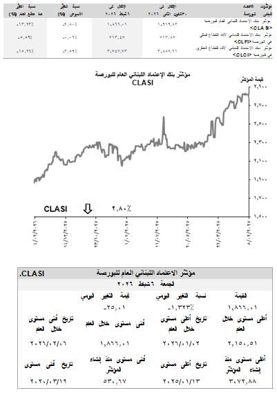 من جهةٍ أخرى، إنخفضت الرسملة السوقيّة (Market Capitalization) لبورصة بيروت بنسبة 2.70% على صعيد أسبوعي إلى حوالي 17.19 مليار د.أ.، وذلك في ظلّ التراجع في أسعار ثلاثة أسهم وغياب أيّ تحسّن في أسعار أسهم آخرى. في هذا الإطار، أنهى مؤشِّر بنك الإعتماد اللبناني للبورصة (“CLASI”) أسبوعه على إنخفاض بنسبة 2.80% عن إقفال الأسبوع السابق ليصل إلى 1،866.01.