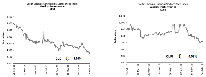 In the real estate sector, trades were mainly concentrated in Solidere “A” and “B” shares (50.62% of weekly traded volume) with the price of Solidere “A” dropping by 3.06% w-o-w to $68.00 and that of Solidere “B” decreasing by 5.78% to $65.25. Consequently, the Credit Libanais Construction Sector Stock Index (“CLCI”) ended Friday’s session down by 3.59% on a weekly basis at 3,747.73.