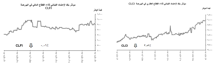 أمّا في القطاع المصرفي، فقد إستحوذت شهادات الإيداع التابعة لبنك لبنان والمهجر على حصّة الأسد (38.59%) من مجموع عدد الأسهُم المتداوَلة خلال الأسبوع المعني. من جهته، أنهى مؤشِّر بنك الإعتماد اللبناني لأداء القطاع المالي في البورصة (“CLFI”) أسبوعه متراجعاً بنسبة 0.06% عن إقفال الأسبوع السابق ليستقرّ عند مستوى 713.47 في ظلّ إنخفاض سعر الأسهم المدرجة التابعة لبنك لبنان والمهجر بنسبة 0.14% إلى 6.99 د.أ.