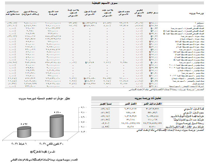 كانت حركة التداول على بورصة بيروت ضعيفة في الأسبوع المنتهي في 6 شباط حيث إنخفض عدد الأسهُم المتداوَلة إلى 158،089 سهم، مقارنةً ب550،346 سهم في الأسبوع الذي سبقه رافقه تراجع في قيمة الأسهم المتداولة إلى 6.31 مليون د.أ.، مقارنةً ب30.26 مليون د.أ. قبل أسبوع. وقد سَيطَرَت أسهُم القطاع العقاري على الحصّة الأكبر من حجم التداول مشكّلةً نسبة 52.57% من مجموع عدد الأسهم المتداولة.