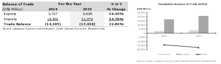 On the current account side of the balance of payments, Lebanon’s balance of trade deficit widened by $3.24 billion (22.84%) in the year 2025 to around $17.44 billion up from around $14.20 billion in the year 2024, according to statistics published by the Lebanese Customs Administration. Said rise in the deficit was triggered by some $4.17 billion increase (24.70%) in imports to just below $21.08 billion, which outweighed by far the $932.45 million annual increase (34.45%) in exports to $3.64 billion.