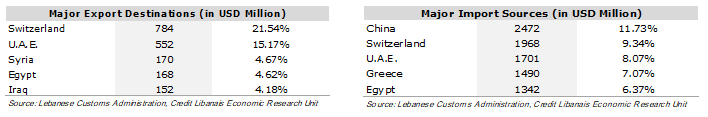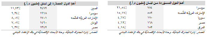 وقد تصدَّرَت سويسرا لائحة الدول المستورِدة من لبنان إذ وصلت فاتورة إستيرادٍها إلى 784 مليون د.أ. (أي 21.54% من مجموع الصادرات اللبنانيّة)، في حين حَلَّت الصين في المرتبة الأولى على لائحة الدول المصدِّرة إلى لبنان حيث وَصَلَت فاتورة صادراتها إلى 2.47 مليار د.أ. (أي 11.73% من مجموع الواردات).