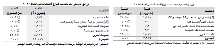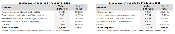 وقد إحتَلَّت صادرات "اللؤلؤ والأحجار الكريمة والمعادن الثمينة والمصوغات" المرتبة الأولى على لائحة السلع المصدَّرة من لبنان، مشكِّلةً حصّة 34.28% (1،248 مليون د.أ.) من مجموع الصادرات اللبنانيّة خلال العام 2025، تلتها صادرات "المعادن العاديّة ومصنوعاتها" (530 مليون د.أ. <14.57%>)، و"منتجات صناعة الأغذية والمشروبات والتبغ" (446 مليون د.أ. <12.25%>) ومن ثمّ "منتجات الصناعات الكيماويّة" (359 مليون د.أ. <9.86%>). في المقابِل، أتت "المنتجات المعدنيّة" في المرتبة الأولى (4،834 مليون د.أ. <22.94%>) على لائحة السلع التي إستوردها لبنان، تبعتها مستوردات "اللؤلؤ والأحجار الكريمة والمعادن الثمينة والمصوغات" (3،957 مليون د.أ. <18.78%>)، و"منتجات الصناعات الكيماويّة" (1،699 مليون د.أ. <8.06%>) و"الآلات والأجهزة الكهربائيّة" (1،623 مليون د.أ. <7.70%>).
