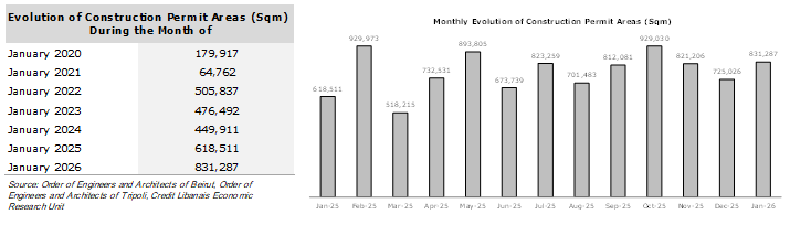 The surface area of construction permits in Lebanon, which reflects the level of future supply in the real estate sector, attained 831,287 sqm in January 2026 compared to 725,026 sqm in December, and 821,206 sqm in November. On an annual basis, the surface area of construction permits came in 34.40% higher than the 618,511 sqm level reported in January 2025. The monthly evolution of construction permit areas between the January 2025 – January 2026 period shows a rollercoaster trend as depicted by the chart below:
