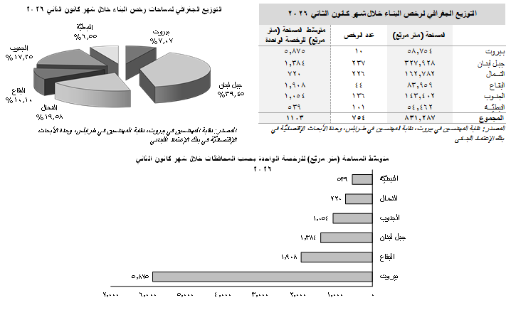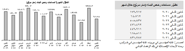 إستناداً إلى إحصاءات نقابة المهندسين، بلغت مساحات البناء المرخَّصة في لبنان، والتي تعكس توقّعات مستوى العرض في القطاع العقاري، 831،287 متر مربّع في شهر كانون الثاني 2026 مقارنةً ب725،026 متر مربّع في شهر كانون الأوّل و821،206 متر مربّع في شهر تشرين الثاني. أمّا على صعيدٍ سنويٍّ، فقد إرتفعت مساحات البناء المرخَّصة بنسبة سنويّة بلغت 34.40% مقارنةً بالمستوى الذي كانت عليه في الشهر الأوّل من العام 2025 والبالغ حينها 618،511 متر مربّع. يظهر التطوّر الشهري لمساحات البناء المرخّصة تقلّبات عديدة خلال الفترة الممتدّة بين شهريّ كانون الثاني 2025 وكانون الثاني 2026 كما هو مبيّن في البيان التالي: