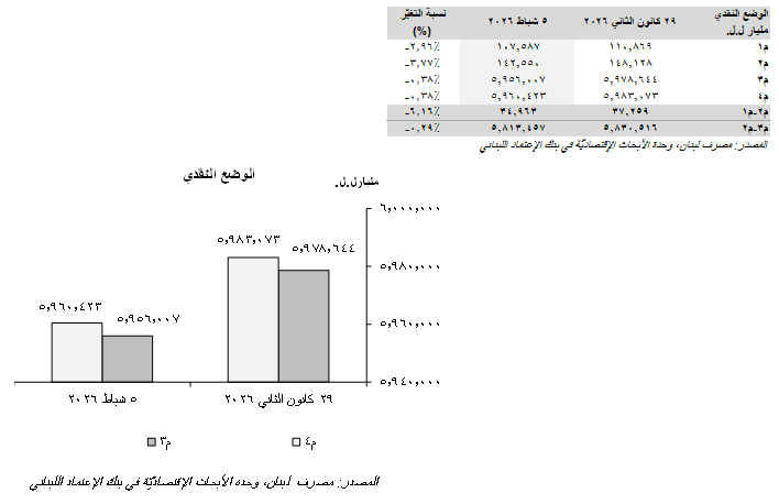 All monetary aggregates ended the week of February 5, 2026 on a negative note. In fact, the overall money supply, “M4”, narrowed by LBP 22,649.51 billion on a weekly basis to LBP 5,960.42 trillion, noting that the non-banking sector’s Treasury bills portfolio decreased by LBP 12.97 billion during the concerned week.
