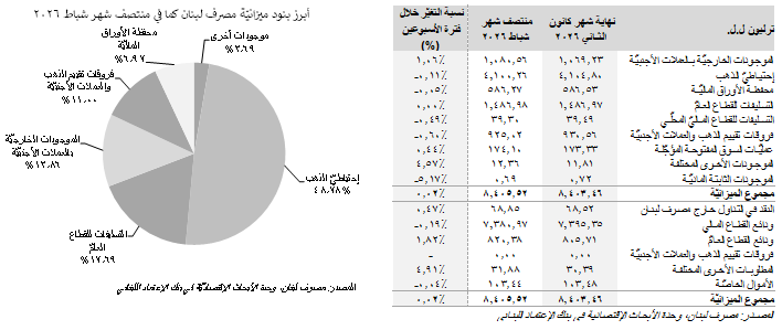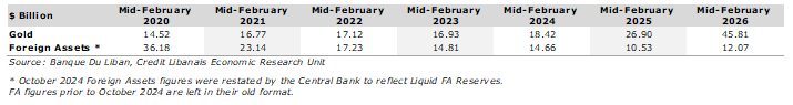 تُظهِر ميزانيّة مصرف لبنان إرتفاع في الموجودات الخارجيّة بالعملات الأجنبيّة بمبلغٍ قدره 126.55 مليون د.أ. (1.06%) خلال النصف الأوّل من شهر شباط 2026 إلى 12.07 مليار د.أ. (1،080.56 ترليون ل.ل.)، مقارنةً مع 11.95 مليار د.أ. (1،069.23 ترليون ل.ل.) قبل فترة أسبوعين. يجدر الذكر أنّ الموجودات الخارجيّة بالعملات الأجنبيّة لدى مصرف لبنان قد شهدت زيادة مضطردة خلال الفترة الممتدّة بين بداية شهر آب 2023 (أيّ عند نهاية ولاية الحاكم السابق رياض سلامة) ومنتصف شهر شباط 2026 بلغت قيمتها الإجماليّة حوالي 3.50 مليار د.أ. عقب سياسة مصرف لبنان النقديّة الجديدة القاضية بالإمتناع عن تسليف الحكومة ورفع الدعم عن معظم السلع والحدّ من طبع العملة المحليّة. في السياق عينه، زادت الموجودات الخارجيّة بالعملات الأجنبيّة لدى مصرف لبنان بحوالي 180 مليون د.أ. منذ مطلع العام الحالي. من جهةٍ أخرى، تُبيِّن ميزانيّة مصرف لبنان إنخفاض في قيمة إحتياطاته من الذهب بلغت نسبته 0.11% (50.72 مليون د.أ.) في النصف الأوّل من شهر شباط 2026 إلى 45.81 مليار د.أ. (4،100.26 ترليون ل.ل.) في ظلّ تراجع أسعار الذهب نتيجة أرقام توظيف أقوى من المتوقّع في الولايات المتّحدة ما خفّف من إحتماليّة قيام الفدرالي الأميركي بتخفيض معدّلات الفوائد على المدى القريب.