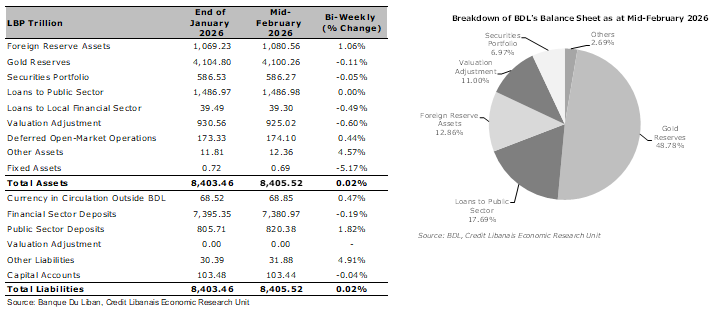 In a related note, BDL’s balance sheet remained almost flat in the first half of February 2026 at LBP 8,405.52 trillion. More specifically, the 1.06% rise in foreign reserve assets, coupled with the 0.44% hike in deferred market operations to LBP 174.10 trillion, and the 4.57% increase in other assets to LBP 12.36 trillion slightly outweighed the 0.60% drop in the valuation adjustment account to LBP 925.02 trillion, the 0.11% decrease in gold reserves, and the 0.05% drop in the value of the securities portfolio to LBP 586.27 trillion.