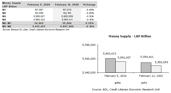 All monetary aggregates ended the week of February 12, 2026 on a negative note. In fact, the overall money supply, “M4”, narrowed by LBP 6,011.69 billion on a weekly basis to LBP 5,954.41 trillion, noting that the non-banking sector’s Treasury bills portfolio decreased by LBP 63.81 billion during the concerned week.