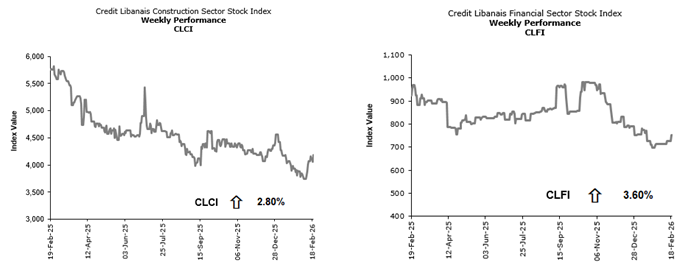 In the real estate sector, trades were mostly concentrated in Solidere “A” and “B” shares (62.61% of weekly traded volume) with the price of Solidere “A” rising by 5.02% w-o-w to $77.40 and that of Solidere “B” increasing by 0.34% to $73.45. Similarly, the price of Holcim Liban shares inched higher by 0.07% w-o-w to $71.05. Consequently, the Credit Libanais Construction Sector Stock Index (“CLCI”) ended Friday’s session up by 2.80% on a weekly basis at 4,180.54.