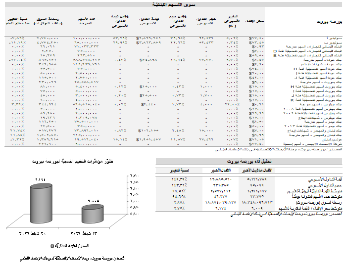 إنتعشت حركة التداول على بورصة بيروت بشكلٍ ملحوظ في الأسبوع المنتهي في 20 شباط حيث إرتفع عدد الأسهُم المتداوَلة إلى 231،385 سهم، مقارنةً ب95،099 سهم في الأسبوع الذي سبقه رافقه زيادة في قيمة الأسهم المتداولة إلى 12.89 مليون د.أ.، مقارنةً ب5.17 مليون د.أ. قبل أسبوع. وقد سَيطَرَت أسهُم القطاع العقاري على الحصّة الأكبر من حجم التداول مشكّلةً نسبة 74.48% من مجموع عدد الأسهم المتداولة.