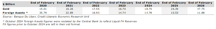 أمّا على صعيد سنوي، فقد إرتفعت الموجودات الخارجيّة بالعملات الأجنبيّة لدى مصرف لبنان ب1.35 مليار د.أ. (12.81%) من 10.53 مليار د.أ. في نهاية شهر شباط 2025. في إطارٍ متّصل، تظهر ميزانيّة مصرف لبنان زيادة في قيمة إحتياطات الذهب ب21.36 مليار د.أ. (80.94%) على صعيد سنوي عند مقارنتها بالمستوى المُسَجَّل في نهاية شهر شباط من العام 2025، والبالغ حينها 26.39 مليار د.أ. نتيجة مواصلة أسعار الذهب وتيرتها التصاعديّة في ظلّ نسب التضخّم العالية والحرب التجاريّة العالميّة التي فرضتها الولايات المتّحدة والتراجع في معدّلات الفوائد والتوتّرات الجيوسياسيّة.