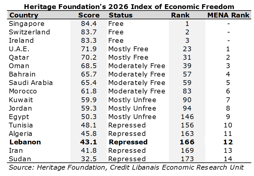 Locally, Lebanon scored 43.1 in the 2026 IEF, compared to a score of 44.1 in 2025, losing 1 position to rank as the 166th freest economy in the world and 12th in the MENA region only trailed by Iran (score: 41.8; global rank:169) and Sudan (score: 32.5; global rank:173). Finally, it is worth noting that Lebanon’s economic freedom was categorized as “Repressed” for the fifth consecutive year.