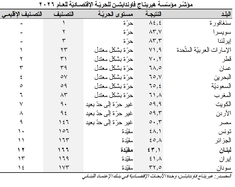 محلّيّاً، سَجَّلَ لبنان نتيجة 43.1 في مؤشّر الحريّة الإقتصاديّة للعام 2026، مقارنةً بنتيجة 44.1 في مؤشّر العام 2025، متراجعاً بمركز واحد ليحتلّ بذلك المرتبة 166 عالميّاً والمرتبة ال12 بين نظرائه في منطقة الشرق الأوسط وشمال أفريقيا، متفوّقاً فقط على إيران (نتيجة: 41.8؛ المركز العالمي: 169) والسودان (نتيجة: 32.5؛ المركز العالمي: 173). وقد صنّف لبنان ضمن الإقتصادات "المقيّدة" للعام الخامس على التوالي.