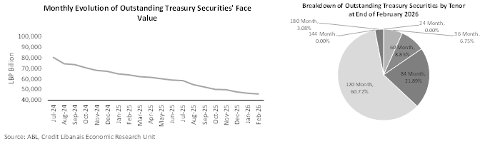 According to the ABL’s monthly Treasury Bills publication, the face value of the outstanding LBP treasury securities’ portfolio fell by 1.28% in February 2026 to LBP 45,954 billion, down from LBP 46,549 billion a month earlier. Furthermore, and on an annual basis, the outstanding face value of LBP treasury securities dropped by 28.05% (LBP 17,911 billion) when compared to the LBP 63,865 billion reading of February 2025. The continuous drop in the outstanding balance of the treasury securities portfolio may be explained by the Ministry of Finance’s decision in December 2023 to suspend the issuance of new securities. It is worth highlighting that 60.72% of the outstanding treasury securities’ portfolio had a tenor of 120 months as at end of February 2026, followed by the 84-month (21.89%), 60-month (8.85%) and 36-month (6.75%) tenor securities.