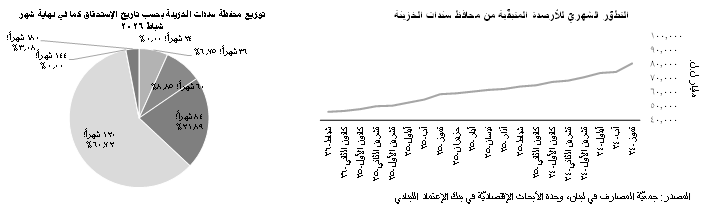 بحسب إحصاءات جمعيّة المصارف، تراجعت محفظة سندات الخزينة بنسبة 1.28% في شهر شباط 2026 إلى 45،954 مليار ل.ل. من 46،549 مليار ل.ل. في شهر كانون الثاني. كذلك، وعلى صعيد سنويّ، تراجعت محفظة سندات الخزينة القائمة بنسبة 28.05% (17،911 مليار ل.ل.) من 63،865 مليار ل.ل. في نهاية الشهر الثاني من العام 2025. يأتي هذا التراجع المستمرّ في القيمة الإسميّة لهذه المحفظة في ظلّ توقّف وزارة المال منذ شهر كانون الأول 2023 عن إصدار سندات جديدة. وقد شكّلت سندات الخزينة التي تبلغ مدّة إستحقاقها 120 شهراً حصّة الأسد (60.72%) من الرصيد المتبقّي لسندات الخزينة بالليرة اللبنانيّة كما في نهاية شهر شباط 2026، تلتها تلك من فئة ال84 شهراً (حصّة 21.89%) وتلك من فئة ال60 (8.85%) وال36 (6.75%) شهراً للذكر لا للحصر.