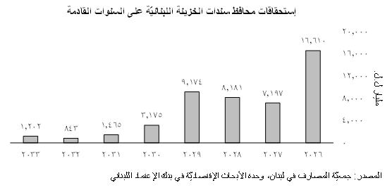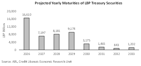 ومن المتوقّع بأن يشهد العام 2026 إستحقاق سندات بقيمة 16،610 مليار ل.ل. (34.7%) يبقى الرصيد الغير مستحقّ منها 14،717 مليار ل.ل. حتّى نهاية العام 2026 مع العلم أنّ 1،893 مليار ل.ل. قد إستحقّ في الشهرين الأوّلين من العام الحالي. كذلك من المتوقّع أن تشهد الأعوام 2027 و2028 إستحقاق سندات قيمتها 7،197 مليار ل.ل. (15.0%) و8،181 مليار ل.ل. (17.1%) بالتتالي. يظهر البيان التالي توزيع إستحقاقات سندات الخزينة اللبنانيّة خلال الفترة الممتدّة بين العامين 2026 و2033:
