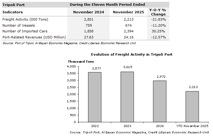 Freight activity via the Port of Tripoli dropped during the month of November 2025 with the total weight of shipped goods decreasing to 153 thousand tons compared to 243 thousand tons a month earlier (37.04% decrease). Imported freight accounted for 81.05% (124 thousand tons) of total freight, while export activity constituted 18.95% (29 thousand tons). On a cumulative basis, Tripoli Port freight activity show some 21.83% y-o-y drop in the total weight of shipped goods to 2,213 thousand tons (of which import freight totaling 1,671 thousand tons and export freight amounting to 542 thousand tons) in the first eleven months of 2025 compared to 2,831 thousand tons in the same period in 2024. Similarly, the number of vessels decreased by 11.20% on a yearly basis to 674 while the number of imported cars increased by 556 (30.25%) to 2,394 cars. In this context, port-related revenues dropped by 12.57% y-o-y to $24.16 million up until November 2025, compared to $27.63 million in the first eleven months of 2024.