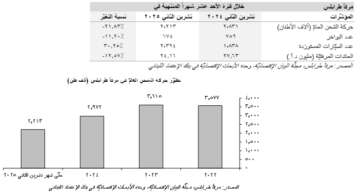 تراجعت حركة الشحن العامّ عبر مرفأ طرابلس خلال الشهر الحادي عشر من العام 2025 حيث إنخفض الوزن الإجمالي للبضائع إلى 153 ألف طن في شهر تشرين الثاني مقابل حوالي 243 ألف طن في شهر تشرين الأوّل (تراجع شهريّ نسبته 37.04%). في التفاصيل، شَكَّلَت الشحنات الوارِدة 81.05% (124 ألف طن) من الوزن الإجمالي للبضائع، في حين بلغت نسبة الحمولات المصدَّرة 18.95% (29 ألف طن). كذلك على صعيدٍ تراكميٍّ، فقد تراجع الوزن الإجمالي للبضائع المشحونة عبر مرفأ طرابلس بنسبة سنويّة بلغت 21.83% إلى 2،213 ألف طن (منها شحنات واردة بوزن إجمالي بلغ 1،671 ألف طن وحمولات مصدّرة ذات وزن إجمالي بلغ 542 ألف طن) في الأشهر الإحدى عشر الأولى من العام 2025 مقارنةً ب2،831 ألف طن خلال الفترة نفسها من العام 2024. بالتوازي، إنخفض عدد البواخر بنسبة 11.20% على أساس سنويّ إلى 674 باخرة فيما زاد عدد السيّارات المستوردة ب556 (30.25%) إلى 2،394 سيّارة مقارنةً ب1،838 سيّارة خلال الفترة نفسها من العام 2024. أمّا في ما يخصّ العائدات المرفئيّة لمرفأ طرابلس، فقد إنكمشت هذه الأخيرة بنسبة سنويّة قدرها 12.57% إلى 24.16 مليون د.أ. حتّى شهر تشرين الثاني 2025 مقارنةً ب27.63 مليون د.أ. في الفترة نفسها من العام 2024.