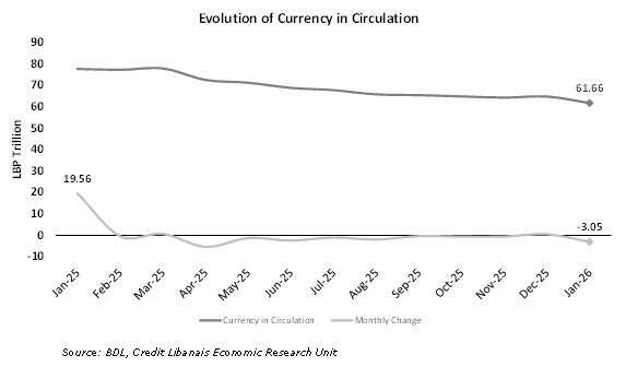 The “M1” monetary aggregate rose by 0.20% in January 2026 to LBP 111.67 trillion, up from LBP 111.44 trillion in the previous month, noting that it decreased by 8.16% y-o-y when benchmarked to the LBP 121.59 trillion level registered in January 2025. More specifically, demand deposits rose by 7.02% in January 2026 to LBP 50.01 trillion, which outweighed the 4.72% drop in currency in circulation in LBP to LBP 61.66 trillion. It is worth noting that currency in circulation came in 20.58% lower on an annual basis when benchmarked to January 2025’s figure of LBP 77.64 trillion. The chart below captures the monthly evolution of currency in circulation between January 2025 and January 2026: