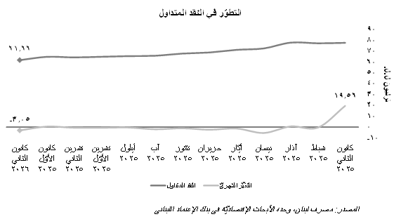 إرتفعت الكتلة النقديّة "م1" بنسبة 0.20% في شهر كانون الثاني 2026 إلى 111.67 ترليون ل.ل.، من 111.44 ترليون ل.ل. في الشهر الذي سبقه، علماً أنّها إنخفضت بنسبة 8.16% سنويّاً عند مقارنتها بالمستوى البالغ 121.59 ترليون ل.ل. المسجّل في شهر كانون الثاني من العام 2025. بالتفاصيل، زاد حجم الودائع تحت الطلب بالليرة اللبنانيّة بنسبة 7.02% على أساس شهريّ إلى 50.01 ترليون ل.ل. ما طغى على إنخفاض النقد المتداول بالليرة بنسبة 4.72% إلى 61.66 ترليون ل.ل. يجدر الذكر أنّ النقد المتداول قد تراجع بنسبة 20.58% على صعيد سنويّ مقارنةً بأرقام شهر كانون الثاني 2025 حيث بلغ حينها 77.64 ترليون ل.ل. يظهر البيان التالي التطوّر الشهريّ في النقد المتداول بين شهريّ كانون الثاني 2025 وكانون الثاني 2026: