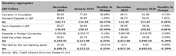 The “M2” component, which adds term deposits in LBP to “M1”, remained flat in January 2026 at LBP 150.03 trillion, noting that it stood at LBP 156.47 trillion in January 2025. As for the “M3” component, which adds deposits in foreign currencies and debt securities issued to the “M2” monetary aggregate, it fell by 0.39% month-on-month to LBP 5,999.39 trillion in January 2026 down from LBP 6,022.68 trillion in the previous month. The overall money supply, “M4”, which adds LBP treasury bills held by the non-banking sector, also dropped by 0.39% between the first month of 2026 and last month of 2025, reaching LBP 6,003.82 trillion (compared to LBP 6,027.39 trillion in December 2025) noting that the portfolio of LBP Treasury bills held by the non-banking sector dropped by 5.95% month-on-month to LBP 4.43 trillion.