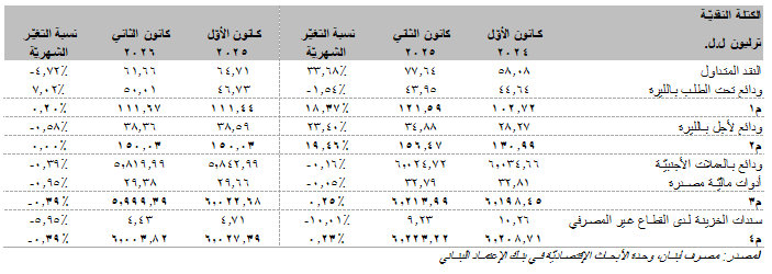 وقد بقيت الكتلة النقديّة "م2"، والتي تضيف الودائع لأجل بالليرة إلى مكوّن ال"م1"، مستقرّة في شهر كانون الثاني من العام 2026 عند 150.03 ترليون ل.ل.، علماً أنّها كانت قد بلغت 156.47 ترليون ل.ل. في شهر كانون الثاني 2025. أمّا بالنسبة للكتلة النقديّة ال"م3"، والتي تضيف الودائع بالعملات الأجنبيّة وأدوات ماليّة مصدرة إلى ال"م2"، فقد تراجعت هذه الأخيرة بنسبة 0.39% خلال شهر كانون الثاني إلى حوالي 5،999.39 ترليون ل.ل. من 6،022.68 ترليون ل.ل. في الشهر الذي سبقه كما هو الحال بالنسبة إلى الكتلة النقديّة بمفهومها الواسع، "م4" (والتي تضيف إلى "م3" سندات الخزينة لدى القطاع غير المصرفي)، والتي شهدت إنخفاضاً بنسبة 0.39% في الشهر الأوّل من العام 2026 إلى حوالي 6،003.82 ترليون ل.ل. من 6،027.39 ترليون ل.ل. في شهر كانون الأوّل 2025 علماً أنّ محفظة سندات الخزينة بالليرة المملوكة من القطاع غير المصرفي قد تراجعت بنسبة شهريّة بلغت 5.95% إلى 4.43 ترليون ل.ل.