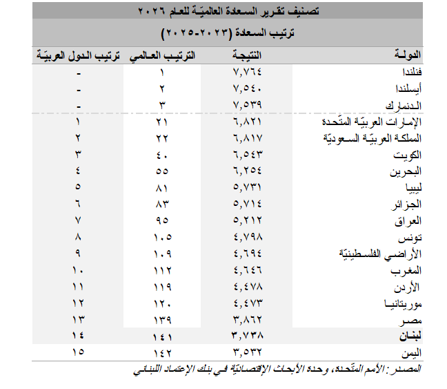 Locally, Lebanon ranked second to last amongst Arab countries and 141st globally in the 2026 World Happiness Report with a score of 3.738, yet registered a significant improvement compared to the 3.188 score registered in the previous edition.