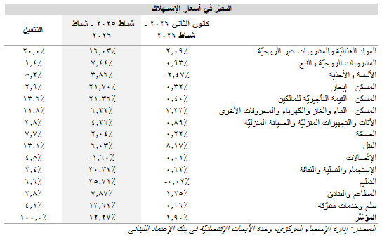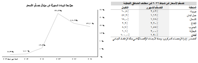 تُظهِر الإحصاءات الصادرة عن إدارة الإحصاء المركزي أنّ مؤشِّر أسعار الإستهلاك في لبنان قد زاد بنسبة 1.90% خلال شهر شباط 2026 مقارنةً بتراجع بلغت نسبته 0.08% في شهر كانون الثاني. على صعيدٍ سنويٍّ، سَجَّلَ مؤشِّر تضخُّم الأسعار إرتفاع بلغت نسبته 12.27% إلى 8،068.09 في الشهر الثاني من العام 2026، مقارنةً بمستوى بلغ 7،186.41 في الشهر نفسه من العام 2025. وقد بلغ متوسّط الزيادة السنويّة في مؤشّر تضخّم الأسعار 11.59% خلال الشهرين الأوّلين من العام 2026. يمكن تعليل التباطؤ الملحوظ في معدّلات التضخّم منذ نهاية العام 2023 بإنتشار دولرة السلع والخدمات وإستقرار سعر صرف الليرة اللبنانيّة مقابل الدولار الأميركي منذ شهر تمّوز 2023. بالتفاصيل، إرتفعت أسعار المواد الغذائيّة والمشروبات غير الروحيّة بنسبة سنويّة بلغت 16.03% (تثقيل بنسبة 20.0%)، رافقها زيادة بنسبة 21.36% في أسعار المسكن (القيمة التأجيريّة للمالكين؛ تثقيل بنسبة 13.6%) وإرتفاع بنسبة 6.03% في أسعار النقل (تثقيل بنسبة 13.1%) نتيجة موافقة الحكومة اللبنانيّة على زيادة أسعار المحروقات ب300،000 ل.ل. لكلّ 20 ليتر من الوقود، وزيادة بنسبة 6.22% في أسعار المسكن (الماء والغاز والكهرباء والمحروقات الأخرى) (تثقيل بنسبة 11.8%) وفي كلفة الصحّة بنسبة 2.04% (تثقيل بنسبة 7.7%) وغلاء بنسبة 35.71% في أسعار التعليم (تثقيل بنسبة 6.6%). تجدر الإشارة إلى أنّ أسعار الألبسة والأحذية (تثقيل بنسبة 5.2%) قد إرتفعت بنسبة 3.86% على صعيدٍ سنويٍّ في شهر شباط 2026 رافقها زيادة في أسعار المطاعم والفنادق بنسبة 7.87% (تثقيل بنسبة 2.8%) وإرتفاع في أسعار الإستجمام والتسلية والثقافة (تثقيل بنسبة 2.4%) بنسبة 30.32%. من جهةٍ أخرى، كانت فئة الإتّصالات (تثقيل بنسبة 4.5%) المكوّن الوحيد الذي شهد تراجعاً سنويّاً في الأسعار في الشهر الثاني من العام 2026 حيث إنخفضت أسعار الإتّصالات بنسبة 1.60% عن مستوياتها المسجّلة في شباط 2025. تُظهر الفقرة التالية تقلّبات أسعار البنود في مؤشِّر أسعار الإستهلاك: