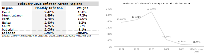 On a geographical basis, all regions across Lebanon saw a monthly rise in their CPI values in February 2026, with the sharpest increase taking place in the Bekaa (2.90%), followed by the Beirut (2.42%), Nabatieh (2.00%), North (1.78%), Mount Lebanon (1.69%), and South (1.55%) regions.