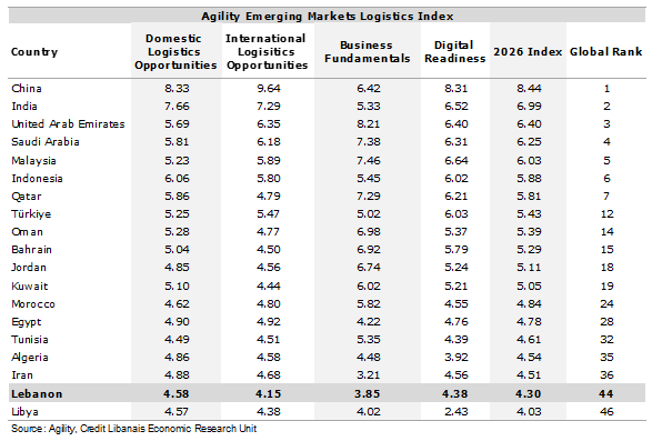 On the local front, Lebanon came in 44th among the 50 covered nations in the 2026 Emerging Markets Logistics Index with a score of 4.30, in comparison with a score of 4.37 in 2025. In fact, Lebanon’s worst performance was in the Business Fundamentals sub-index (score: 3.85; rank: 41), yet fared best in the Domestic Logistics Opportunities sub-index (score: 4.58; rank: 38) followed by the Digital Readiness (score: 4.38; rank: 38), and International Logistics (score: 4.15; rank: 50) sub-indices.