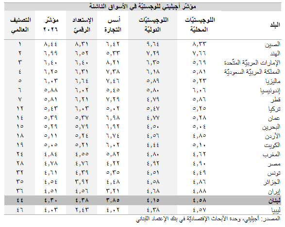 محليّاً، حلّ لبنان في المرتبة 44 من أصل 50 دولة في العالم في مؤشّر أجيليتي للّوجيستيّة في الأسواق الناشئة للعام 2026 محقّقاً نتيجة 4.30، مقارنةً بنتيجة 4.37 في العام 2025. في التفاصيل، سجّل لبنان أداءه الأسوأ في المؤشّر المتعلّق بأسس التجارة (النتيجة: 3.85؛ المرتبة: 41)، في حين كان أداؤه الأفضل في مؤشّر اللوجيستيّات المحليّة (النتيجة: 4.58؛ المرتبة: 38) متبوعاً بمؤشّر الإستعداد الرقمي (النتيجة: 4.38؛ المرتبة: 38) ومؤشّر اللوجستيّات الدوليّة (النتيجة: 4.15؛ المرتبة: 50).