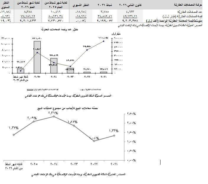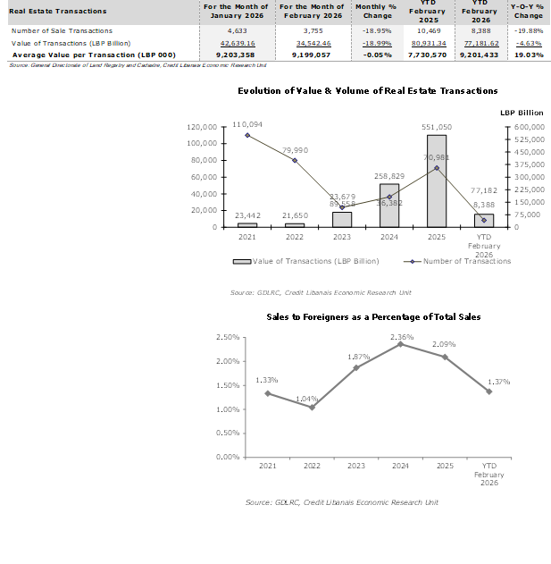 شهدت الحركة العقاريّة خلال شهر شباط 2026 إنخفاض في عدد المعاملات العقارية بنسبة 18.95% إلى 3،755 وتدنّي في قيمتها بنسبة 18.99% إلى 34.54 ترليون ل.ل. نتيجة لذلك، بقي متوسّط قيمة المعاملة الواحدة شبه مستقرّ على أساس شهري عند 9.20 مليار ليرة لبنانّية (حوالي 102.78 ألف د.أ. على سعر صرف ال89،500 ل.ل مقابل الدولار). وتُعزى الأرقام المنخفضة في شهر شباط إلى تعذّر الحصول على إحصائات الدوائر العقاريّة في النبطيّة وصيدا بسبب إندلاع الحرب في أوائل شهر آذار. على أساس تراكمي، وصل عدد المعاملات العقارية خلال الشهرين الأولين من العام 2026 إلى 8،388 أي بإنخفاض سنوي نسبته 19.88% مقارنةً بالمستوى الذي كان عليه في الفترة ذاتها من العام السابق والبالغ حينها 10،469 معاملة كما وتراجعت قيمة هذه المعاملات بنسبة 4.63% إلى 77.18 ترليون ل.ل. (0.86 مليار د.أ.) مقارنةً مع 80.93 ترليون ل.ل. (حوالي 0.90 مليار د.أ.) خلال الفترة ذاتها من العام السابق. وقد إنكمشت حصّة الأجانب من عمليّات المبيع العقاريّة إلى 1.37% مع نهاية شهر شباط من العام 2026، من 2.09% في كامل العام 2025 و2.36% في كامل العام 2024 كما هو مبيّن أدناه: