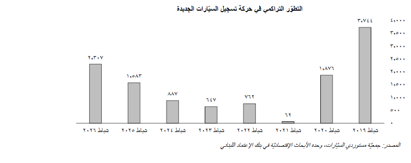 على صعيد تراكمي، زاد عدد السيّارات الجديدة المسجّلة بنسبة سنويّة بلغت 45.74% عند مقارنته بالمستوى المسجّل في الشهرين الأوّلين من العام 2025 والبالغ 1،583 سيّارة وذلك نتيجة التحسّن في المشهدين السياسي والأمني (قبل إندلاع الحرب الأخيرة في لبنان وفي المنطقة) كما وتطبيق بعض الإصلاحات في مصلحة تسجيل السيّارات. إلّا إنّ هذه الأرقام تبقى خجولة مقارنةً بمستوى ال3،744 سيّارة جديدة المسجّلة في الشهرين الأوّلين من العام 2019.