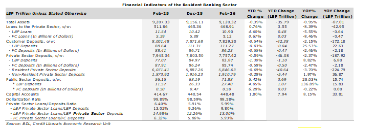 According to BDL statistics, the combined balance sheet of commercial banks operating in Lebanon narrowed by 0.39% (LBP 35.79 trillion) during the first two months of the year 2026 to LBP 9,120.32 trillion, down from LBP 9,156.11 trillion in December 2025. On an annual basis, the combined assets of the resident banking sector came in 0.95% lower than the LBP 9,207.33 trillion reading reported at end of February 2025.
