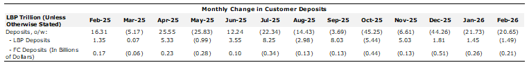On the funding side of the balance sheet, customer deposits dropped by 0.54% (LBP 42.38 trillion) by end of February 2026 to LBP 7,829.30 trillion with resident private sector deposits decreasing by 0.69% (LBP 40.64 trillion) to LBP 5,846.63 trillion, non-resident private sector deposits dropping by 0.28% (LBP 5.44 trillion) to LBP 1,910.79 trillion, and public sector deposits improving by 5.42% (LBP 3.69 trillion) to LBP 71.88 trillion. From a currency denomination standpoint, deposits in Lebanese Pounds inched downwards by 0.03% (LBP 0.04 trillion) YTD February to LBP 111.27 trillion and foreign currency deposits dropped by 0.55% ($0.47 billion) to $86.23 billion. On a monthly basis, LBP deposits decreased by LBP 1.49 trillion in February and FC deposits fell by $214.12 million. In this context, the deposit dollarization rate reached 98.58% at end of February 2026 in comparison with 98.59% at end of year 2025 and 98.89% at end of February 2025. On an annual basis, total customer deposits narrowed by 2.15% (LBP 172.18 trillion) from a reading of LBP 8,001.48 trillion at end of February 2025.