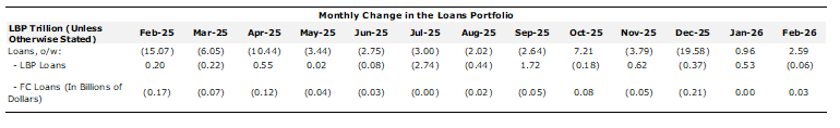 On the lending front, loans to the private sector (residents and non-residents) rose by 0.76% (LBP 3.55 trillion) during the first two months of 2026 to LBP 468.91 trillion, up from LBP 465.36 trillion in December 2025. More specifically, LBP denominated loans increased by 4.60% (LBP 0.48 trillion) to LBP 10.90 trillion while foreign currency loans rose by 0.67% ($34.27 million) to $5.12 billion. On a monthly basis, LBP denominated loans receded by LBP 0.06 trillion whereas FC denominated ones increased by $29.51 million. The ratio of loans to deposits attained 5.99% at end of February 2026 compared to 5.91% at end of year 2025 and 6.40% at end of February 2025. More specifically, the ratio of LBP-denominated private sector loans to total LBP deposits stood at 9.80% in February compared to 9.36% in December 2025 and 13.02% in the second month of 2025 while the ratio of foreign currency-denominated private sector loans to total foreign currency deposits reached 5.93% at end of February 2026 in comparison with 5.86% at end of December 2025 and 6.32% in February 2025. On an annual basis, the loans portfolio sank by 8.39% (LBP 42.95 trillion) from a reading of LBP 511.86 trillion at end of February 2025.