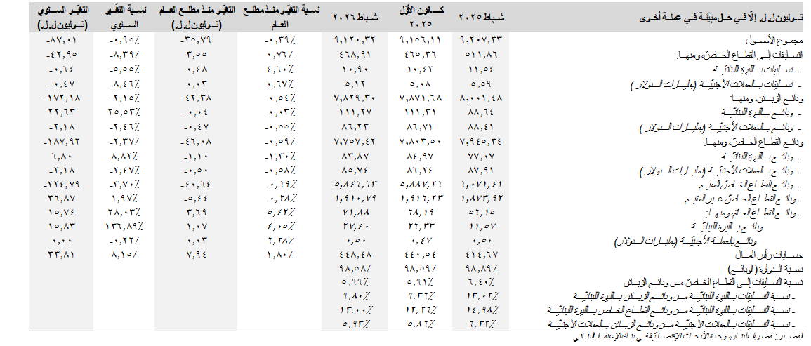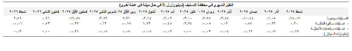 في المقلب الآخر، إرتفعت تسليفات المصارف اللبنانيّة إلى القطاع الخاصّ (المقيمين وغير المقيمين) بنسبة 0.76% (3.55 ترليون ل.ل.) خلال الشهرين الأوّلين من العام 2026 إلى 468.91 ترليون ل.ل. مقابل 465.36 ترليون ل.ل. في نهاية العام 2025. بالتفاصيل، فقد تحسّنت التسليفات المعنونة بالليرة اللبنانيّة بنسبة 4.60% (0.48 ترليون ل.ل.) خلال الشهرين الأوّلين من العام 2026 إلى 10.90 ترليون ل.ل.، كما وتطوّرت التسليفات المعنونة بالعملات الأجنبيّة بنسبة 0.67% (34.27 مليون د.أ.) إلى 5.12 مليار د.أ. على صعيد شهري، إنكمشت التسليفات المعنونة بالليرة اللبنانيّة ب0.06 ترليون ل.ل. في حين إرتفعت تلك المعنونة بالعملات الأجنبيّة ب29.51 مليون د.أ . وقد وصل معدّل التسليفات من ودائع الزبائن إلى 5.99% في نهاية شهر شباط 2026، مقابل 5.91% في نهاية العام 2025 و6.40% في نهاية شهر شباط 2025. في التفاصيل، وصلت نسبة التسليفات إلى القطاع الخاصّ المعنونة بالليرة اللبنانيّة من مجموع الودائع المعنونة بالعملة الوطنيّة إلى 9.80% في شهر شباط 2026، مقارنةً مع 9.36% في نهاية العام 2025 و13.02% مع نهاية شهر شباط 2025 كما ووصل معدّل التسليفات المعنونة بالعملات الأجنبيّة إلى 5.93% من مجموع الودائع بالعملات الأجنبيّة، مقابل 5.86% في نهاية العام 2025 و6.32% في شباط 2025. على صعيد سنوي، إنكمشت محفظة التسليفات بنسبة 8.39% (42.95 ترليون ل.ل.) عند مقارنتها بالمستوى الذي كانت عليه في شهر شباط 2025 والبالغ حينها 511.86 ترليون ل.ل.