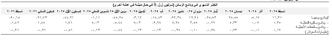 أمّا لجهة الموارد الماليّة، فقد إنخفضت ودائع الزبائن بنسبة 0.54% (42.38 ترليون ل.ل.) خلال الشهرين الأوّلين من العام 2026 إلى 7،829.30 ترليون ل.ل. مع تراجع ودائع القطاع الخاصّ المقيم بنسبة 0.69% (40.64 ترليون ل.ل.) إلى 5،846.63 ترليون ل.ل. وإنكماش ودائع القطاع الخاص غير المقيم بنسبة 0.28% (5.44 ترليون ل.ل.) إلى 1،910.79 ترليون ل.ل. وتسجيل ودائع القطاع العام زيادة بنسبة 5.42% (3.69 ترليون ل.ل.) إلى 71.88 ترليون ل.ل. وقد سجّلت ودائع الزبائن المعنونة بالليرة اللبنانيّة تراجع طفيف بلغت نسبته 0.03% (0.04 ترليون ل.ل.) خلال شهر شباط 2026 إلى 111.27 ترليون ل.ل. فيما تراجعت الودائع المعنونة بالعملات الأجنبيّة بنسبة 0.55% (0.47 مليار د.أ.) إلى 86.23 مليار د.أ. على صعيد شهري، إنخفضت الودائع المعنونة بالليرة اللبنانيّة ب1.49 ترليون ل.ل. كما وتراجعت تلك المعنونة بالعملات الأجنبيّة ب214.12 مليون د.أ. في هذا السياق، وصلت نسبة دولرة الودائع إلى 98.58% في نهاية شهر شباط 2026 مقارنةً بنسبة 98.59% في نهاية العام 2025 و98.89% في نهاية شهر شباط 2025. ويجدر الذكر بأنّ ودائع الزبائن قد إنخفضت بنسبة سنويّة بلغت 2.15% (172.18 ترليون ل.ل.) مقارنةً بالمستوى الذي كانت عليه في شهر شباط 2025 والبالغ حينها 8،001.48 ترليون ل.ل.