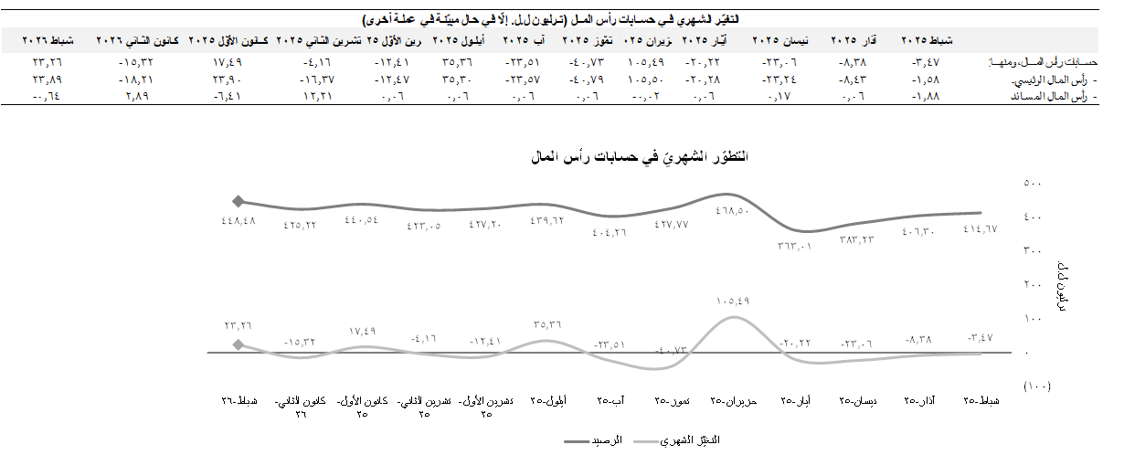 وقد تحسّنت الأموال الخاصّة العائدة للمصارف التجاريّة العاملة في لبنان ب88.73 مليون د.أ. (1.80%) أو ما يعادل 7.94 ترليون ل.ل. خلال الشهرين الأوّلين من العام الحالي إلى 448.48 ترليون ل.ل. (5.01 مليار د.أ.) من 440.54 ترليون ل.ل. (4.92 مليار د.أ.) في نهاية العام 2025. على صعيد شهري، تطوّرت الأموال الخاصّة ب23.26 تريليون ل.ل. (259.87 مليون د.أ.) في الشهر الثاني من العام 2026 بعد تراجع قدره ب15.32 تريليون ل.ل. (171.14 مليون د.أ.) في الشهر الذي سبقه وإرتفاع قدره 17.49 تريليون ل.ل. (195.44 مليون د.أ.) في شهر كانون الأول 2025. ويعزى التحسّن الشهري في الأموال الخاصّة للقطاع المصرفي المقيم إلى إرتفاع رأس المال الرئيسي بنحو 23.89 تريليون ل.ل.، ما طغى على الإنخفاض بقيمة 0.64 تريليون ل.ل. في رأس المال المساند. أمّا على صعيد سنويّ، فقد زادت الأموال الخاصّة التابعة للقطاع المصرفي المقيم بنسبة 8.15% (33.81 ترليون ل.ل.، حوالي 377.72 مليون د.أ.) عند مقارنتها بأرقام شهر شباط 2025 أيّ 414.67 ترليون ل.ل. (حوالي 4.63 مليار د.أ.).