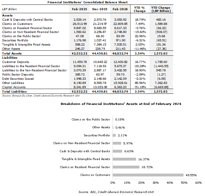According to Banque Du Liban (BDL) statistics, the consolidated balance sheet of financial institutions operating in Lebanon widened by 3.54% (LBP 1,572.93 billion) in the first two months of 2026 to LBP 46,032.74 billion, up from LBP 44,459.81 billion at year-end 2025. This can be attributed to the 7.49% (LBP 1,589.88 billion) increase in claims on customers to LBP 22,809.85 billion, coupled with the 18.79% (LBP 483.16 billion) rise in cash & deposits with central banks to LBP 3,053.92 billion, and the 2.05% (LBP 151.36 billion) increase in the value of fixed assets to LBP 7,535.51 billion, which altogether outweighed the 15.60% (LBP 508.07 billion) drop in claims on the non-resident financial sector to LBP 2,748.80 billion, the 0.76% (LBP 66.22 billion) decrease in claims on the resident financial sector to LBP 8,617.33 billion, and the 6.31% (LBP 65.51 billion) drop in the value of securities portfolio to LBP 971.90 billion. It is worth noting that claims on customers and claims on the resident financial sector are the two largest asset categories on financial institutions’ balance sheet, accounting for 49.55% and 18.72% of total assets on a respective basis. On the liabilities side, financial institutions’ other liabilities rose by 85.96% (LBP 7,362.83 billion) YTD February 2026 to LBP 15,928.61 billion, with customer deposits increasing by 16.77% (LBP 1,785.60 billion) to LBP 12,430.82 billion, and liabilities to the non-resident financial sector rising by 18.90% (LBP 545.78 billion) to LBP 3,432.95 billion, totally eroding the 51.18% (LBP 6,669.88 billion) drop in capital accounts to LBP 6,363.20 billion, the 20.28% (LBP 1,443.55 billion) decrease in liabilities to the resident financial sector to LBP 5,675.37 billion, and the 0.31% (LBP 4.71 billion) drop in issued debt securities to LBP 2,142.09 billion.