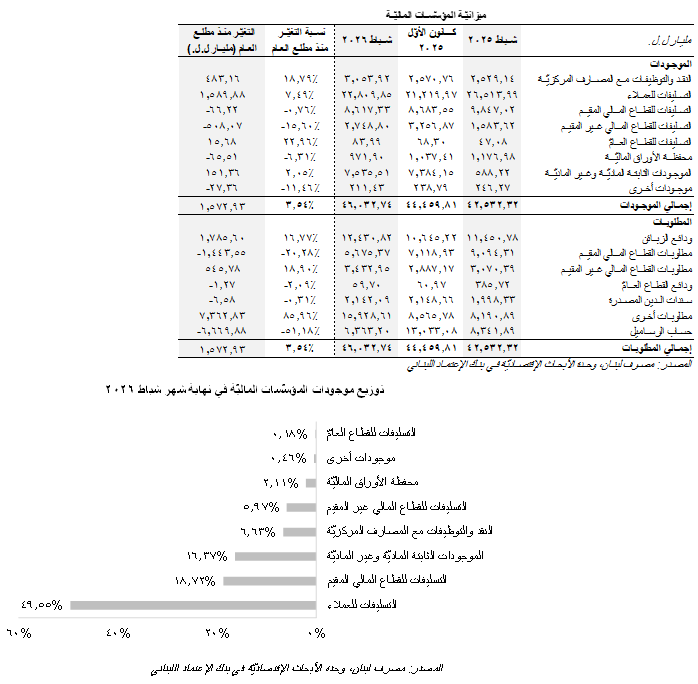 إستناداً إلى إحصاءات مصرف لبنان، إرتفعت الميزانيّة المجمَّعة للمؤسَّسات الماليّة العاملة في لبنان بنسبة 3.54% (1،572.93 مليار ل.ل.) في الشهرين الأوّلين من العام 2026 إلى 46،032.74 مليار ل.ل.، من 44،459.81 مليار ل.ل. في نهاية العام 2025. يُنسَب هذا الإرتفاع بالأخصّ إلى زيادة رصيد التسليفات للعملاء بنسبة 7.49% (1،589.88 مليار ل.ل.) إلى 22،809.85 مليار ل.ل.، ترافقاً مع إرتفاع رصيد النقد والتوظيفات مع المصارف المركزيّة بنسبة 18.79% (483.16 مليار ل.ل.) إلى 3،053.92 مليار ل.ل. وزيادة قيمة الموجودات الثابتة بنسبة 2.05% (151.36 مليار ل.ل.) إلى 7،535.51 مليار ل.ل.، ما طغى على إنخفاض التسليفات للقطاع المالي غير المقيم بنسبة 15.60% (508.07 مليار ل.ل.) إلى 2،748.80 مليار ل.ل. وتراجع التسليفات للقطاع المالي المقيم بنسبة 0.76% (66.22 مليار ل.ل.) إلى 8،617.33 مليار ل.ل. وتدنّي محفظة الأوراق الماليّة بنسبة 6.31% (65.51 مليار ل.ل.) إلى 971.90 مليار ل.ل. يجدر الذكر أنّ محفظة التسليفات إلى الزبائن والتسليفات للقطاع المالي المقيم هما أكبر مُكوِّنين لميزانيّة المؤسَّسات الماليّة، بحيث بلغت حصّتهما 49.55% و18.72% بالتتالي من مجموع الأصول المجمّعة مع نهاية شهر شباط. أمّا على صعيد المطلوبات، فقد إرتفعت قيمة المطلوبات الأخرى بنسبة 85.96% (7،362.83 مليار ل.ل.) حتّى شهر شباط 2026 إلى 15،928.61 مليار ل.ل. رافقه زيادة في رصيد ودائع الزبائن بنسبة 16.77% (1،785.60 مليار ل.ل.) إلى 12،430.82 مليار ل.ل. وإرتفاع قيمة مطلوبات القطاع المالي غير المقيم بنسبة 18.90% (545.78 مليار ل.ل.) إلى 3،432.95 مليار ل.ل.، ما طغى على إنخفاض رصيد حساب الرساميل بنسبة 51.18% (6،669.88 مليار ل.ل.) إلى 6،363.20 مليار ل.ل. وتراجع قيمة مطلوبات القطاع المالي المقيم بنسبة 20.28% (1،443.55 مليار ل.ل.) إلى 5،675.37 مليار ل.ل. وتدنّي رصيد سندات الدين المصدرة بنسبة 0.31% (6.58 مليار ل.ل.) إلى 2،142.09 مليار ل.ل.