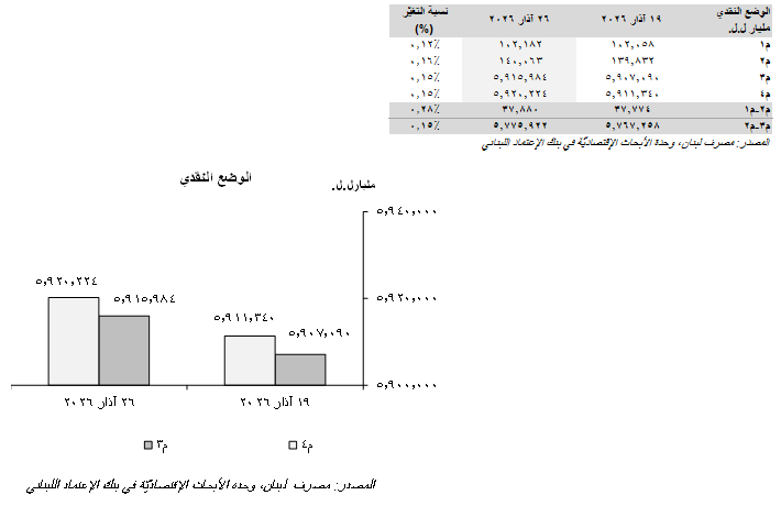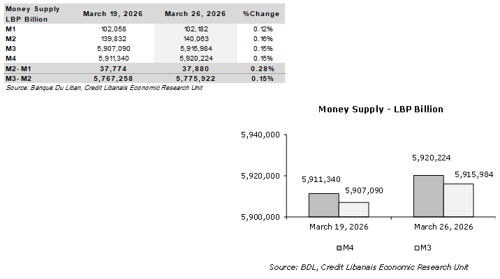 All monetary aggregates ended the week of March 26, 2026 on a positive note. The overall money supply, “M4”, widened by LBP 8,883.68 billion on a weekly basis to LBP 5,920.22 trillion, noting that the non-banking sector’s Treasury bills portfolio decreased by LBP 10.80 billion during the concerned week.