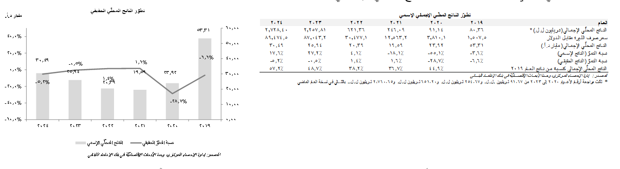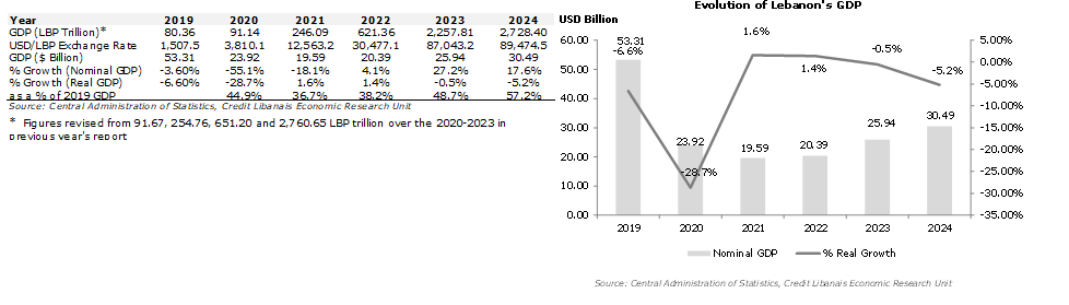 أَصدَرت إدارة الإحصاء المركزي تقريرها حول "الحسابات القوميّة السنويّة " للعام 2024 والذي تسلّط من خلاله الضوء على تطوُّر الناتج المحلّي الإجمالي في لبنان وتقسيمه بحسب القطاعات الإقتصاديّة. وقدَّمت الإدارة بيانات الناتج المحلّي الإجمالي بالليرة اللبنانيّة وبالدولار الأميركي بإستخدام متوسّط أسعار الصرف خلال الأعوام المنصرمة، والتي تدهورت من 1,507.5 ليرة لبنانيّة للدولار في العام 2019 إلى 12،563.2 ليرة لبنانيّة للدولار في العام 2021 و87،043.2 ليرة لبنانيّة للدولار في العام 2023 و89،474.5 ليرة لبنانيّة للدولار في العام 2024. بالأرقام، وصل الناتج المحلّي الإجمالي الإسمي إلى 30.49 مليار د.أ. في العام 2024 (حوالي 57.2% من الناتج المحلي الإجمالي للعام 2019 البالغ 53.31 مليار د.أ.) مقارنةً ب25.94 مليار د.أ. في العام 2023 (حوالي 48.7% من مستوى العام 2019) علماً بأنّ أرقام العام 2023 قد تمّت مراجعتها من 31.71 مليار د.أ. (2،760.65 تريليون ل.ل.) في النسخة السابقة من التقرير. أما بالنسبة للنموّ الحقيقي (الذي يستبعد تأثير التضخّم)، فقد إنكمش الإقتصاد اللبناني في العام 2024 بنسبة 5.2% (وهو ما يُعزى بشكل أساسي إلى الحرب علماً بأنّ مؤسّسات دوليّة عدّة كانت تتوقّع تسجيل لبنان لنموّ إقتصادي في سيناريو ما قبل الحرب) بعد تراجع بنسبة 0.5% في العام 2023. وقد أوضحت إدارة الإحصاء المركزي بأنّ أرقامها تتضمن أثر الإقتصاد غير الرسمي والذي قدّرته بنحو 30% من الناتج المحلّي الإجمالي.