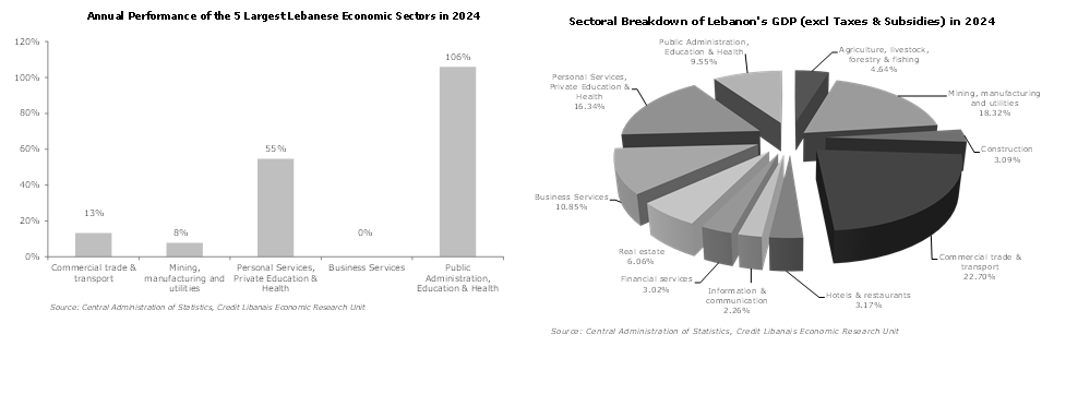 وقد برز قطاع التجارة والنقل كأكبر مساهم في الناتج المحلّي الإجمالي (عند إقتطاع الضرائب والدعم) في العام 2024 بنسبة 22.70%، يليه قطاع التعدين والتصنيع والمرافق العامّة (18.32%)، وقطاع الخدمات الشخصيّة والتعليم والإستشفاء الخاص (16.34%)، وقطاع خدمات الأعمال (10.85%). وفيما يتعلّق بالأداء السنوي لأكبر خمس قطاعات، سجّل قطاع الإدارة العامّة والتعليم والصحّة نموّاً بنسبة 106% في العام 2024 (نتيجة زيادة الحكومة لتقديماتها الإجتماعيّة لموظّفي القطاع العام) يليه قطاع الخدمات الشخصيّة والتعليم والإستشفاء الخاص (نمو بنسبة 55٪) والتجارة والنقل (نمو بنسبة 13٪) على سبيل المثال لا الحصر، كما هو موضح في الرسم البياني التالي: