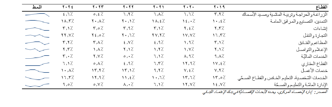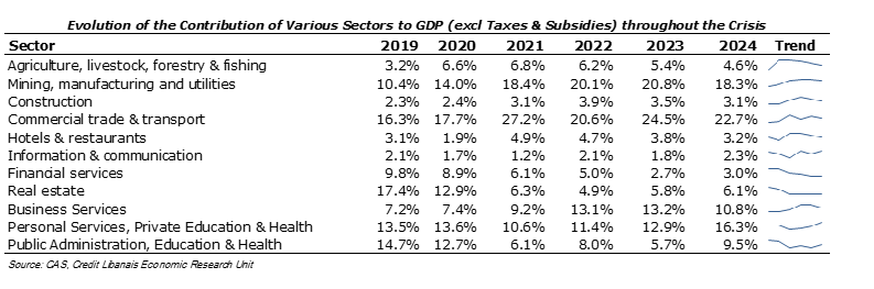 كما هو مبيّن في الجدول أدناه، يتّضح بأنّه كان للأزمة تأثير كبير على قطاع الخدمات الماليّة الذي إنخفضت مساهمته من الناتج المحلّي الإجمالي من 9.8% في العام 2019 إلى حوالي 2.7% في العام 2023 قبل أن تتحسّن بشكل طفيف إلى 3.0% في العام 2024. وينطبق الأمر نفسه على قطاع الإدارة العامة والتعليم والصحة، حيث تدهورت مساهمته من 14.7% من الناتج المحلّي الإجمالي إلى 9.5% خلال الفترة الممتدّة بين عاميّ 2019 و2024 بعد أن بلغ نسبة 5.7% من الناتج الإجمالي المحليّ في العام 2023. من ناحية أخرى، إرتفعت مساهمة قطاع التجارة والنقل من 16.3% من الناتج المحلّي في العام 2019 إلى 22.7% في العام 2024. ومن القطاعات الأخرى التي حققت أداءً قويّاً خلال الأزمة قطاع التعدين والتصنيع والمرافق، حيث ارتفعت مساهمته من 10.4% من الناتج المحلّي الإجمالي في العام 2019 إلى 18.3% في العام 2024.