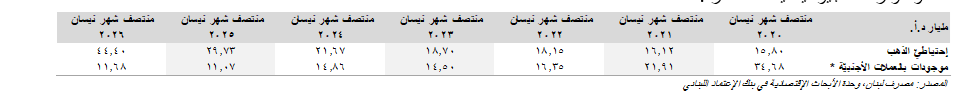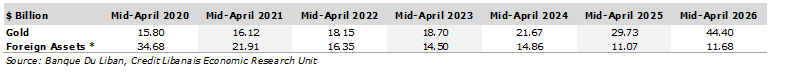 أمّا على صعيد سنوي، فقد إرتفعت الموجودات الخارجيّة بالعملات الأجنبيّة لدى مصرف لبنان ب0.61 مليار د.أ. (5.47%) من 11.07 مليار د.أ. في منتصف شهر نيسان 2025. في إطارٍ متّصل، تظهر ميزانيّة مصرف لبنان زيادة سنويّة في قيمة إحتياطات الذهب ب14.66 مليار د.أ. (49.32%) عند مقارنتها بالمستوى المُسَجَّل في منتصف شهر نيسان من العام 2025، والبالغ حينها 29.73 مليار د.أ. نتيجة إرتفاع أسعار الذهب خلال الفترة المعنيّة في ظلّ نسب التضخّم العالية والحرب التجاريّة العالميّة التي فرضتها الولايات المتّحدة والتراجع في معدّلات الفوائد آنذاك والتوتّرات الجيوسياسيّة المستمرّة.