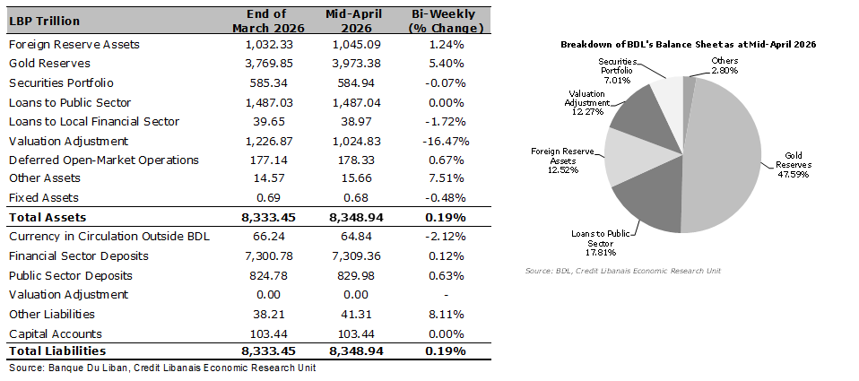 In a related note, BDL’s balance sheet increased by 0.19% in the first half of April 2026 to LBP 8,348.94 trillion amid the 5.40% rise in gold reserves, the 1.24% increase in foreign reserve assets, the 0.67% expansion in deferred open-market operations to LBP 178.33 trillion and the 7.51% appreciation in other assets to LBP 15.66 trillion which all together outweighed the 16.47% drop in the valuation adjustment account to LBP 1,024.83 trillion among others.
