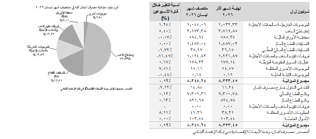في سياقٍ متّصل، إرتفعت ميزانيّة مصرف لبنان بنسبة 0.19% في النصف الأوّل من شهر نيسان 2026 إلى 8،348.94 ترليون ل.ل. حيث أنّ التطوّر في قيمة إحتياطي الذهب ب5.40% وفي الموجودات الخارجيّة بالعملات الأجنبيّة بنسبة 1.24% والزيادة بنسبة 0.67% في قيمة عمليّات السوق المفتوحة المؤجّلة إلى 178.33% وتحسّن قيمة الأصول الأخرى بنسبة 7.51% إلى 15.66 ترليون ل.ل. قد طغوا على إنخفاض فروقات تقييم الذهب والعملات الأجنبيّة بنسبة 16.47% إلى 1،024.83 ترليون ل.ل. للذكر لا للحصر.