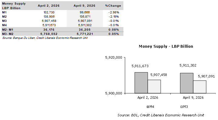 All monetary aggregates ended the week of April 9, 2026 on a negative note. The overall money supply, “M4”, narrowed by LBP 371.76 billion on a weekly basis to LBP 5,911.30 trillion, noting that the non-banking sector’s Treasury bills portfolio decreased by LBP 5.40 billion during the concerned week.